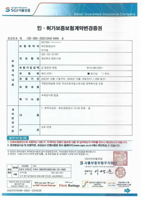 보증보험증권 페이지 정보 작성자최고관리자 댓글 0건 조회 10회 작성일 24-05-30 18:16 본문 보험 목록 글쓰기 이전글허가증 24.05.30 댓글목록 댓글목록 등록된 댓글이 없습니다.